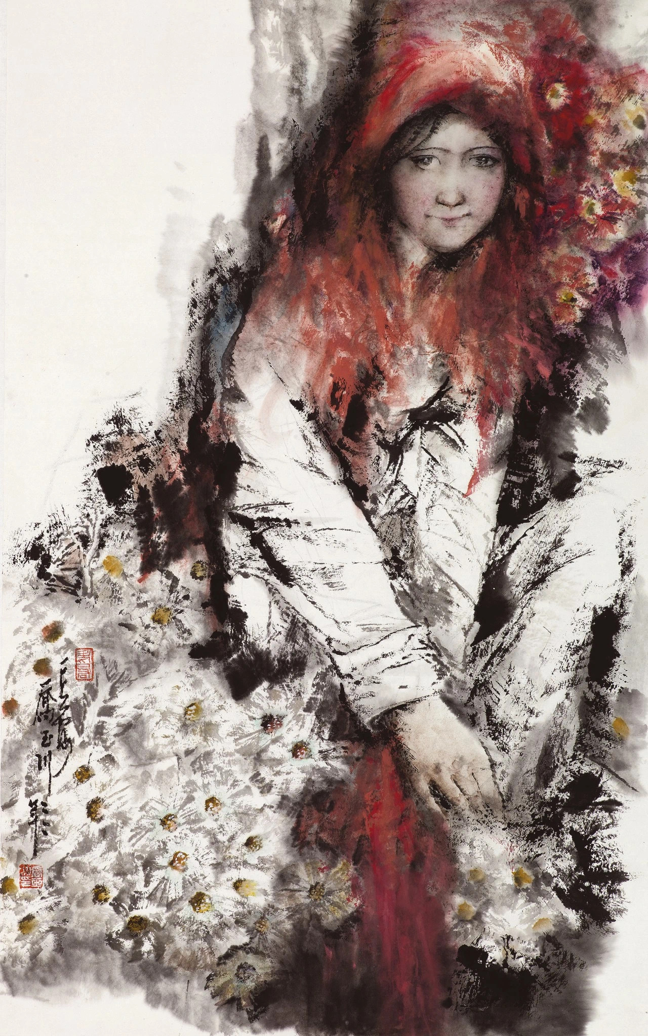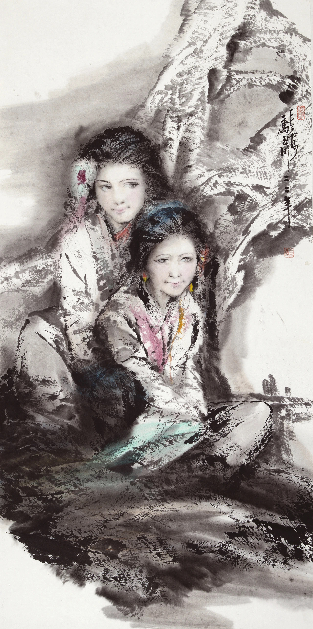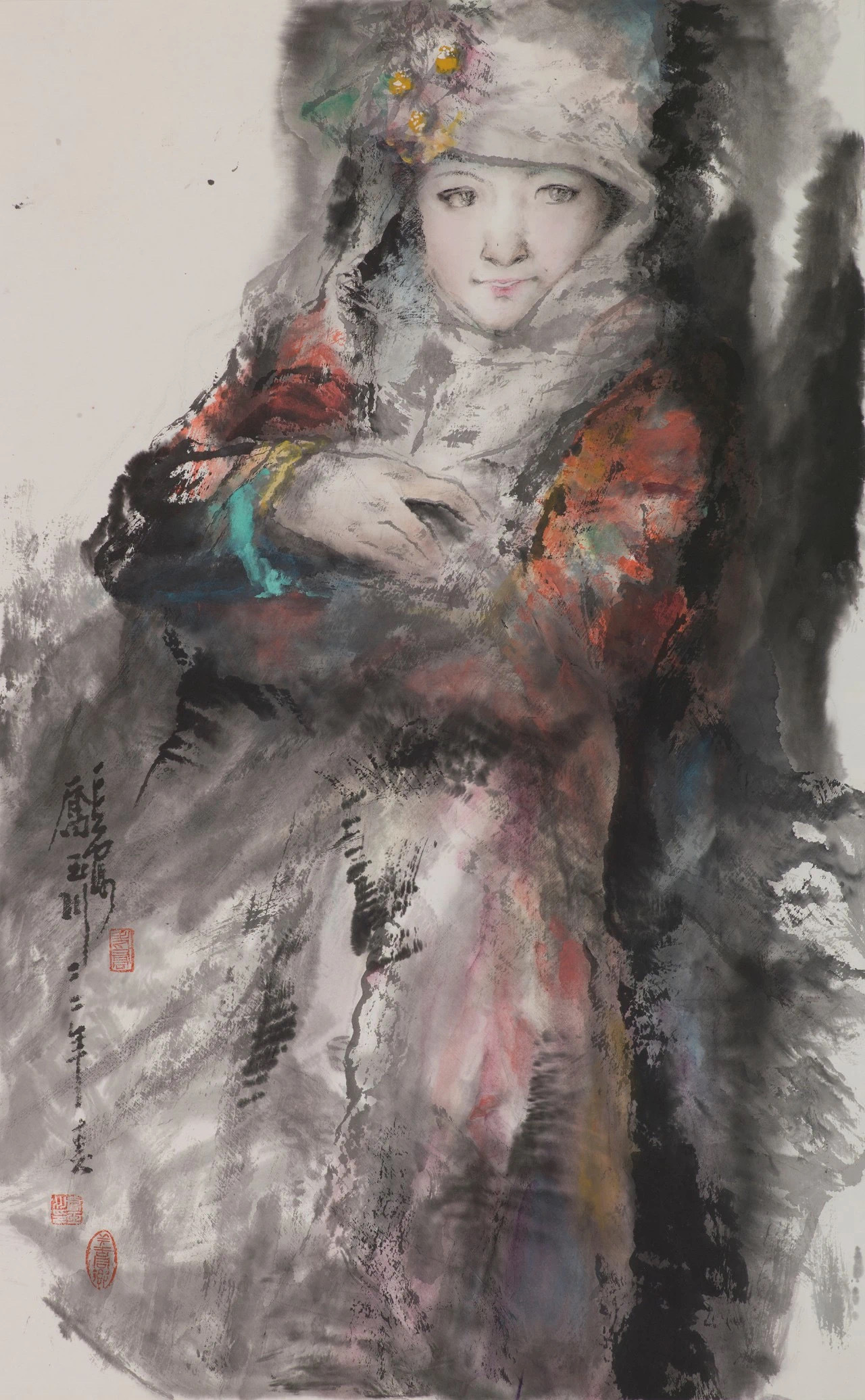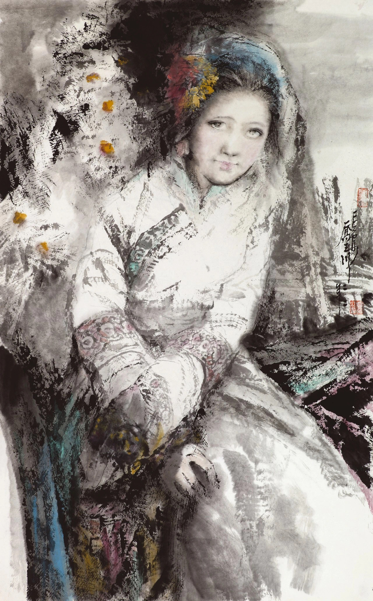看乔玉川先生的作品,他最着力画的人物是美女和老者。他追求理想中最美的女性,像是现代罗敷;他画古代的智者,极具历史感。他对这两个形象不厌其烦地琢磨完善,并且自创了这两个理想的人物程式,他用写生的图式创作了属于乔氏的人物图式。一个艺术家为什么用这么大的精力来塑造非古典、西方、罗马的程式?我想,这肯定蕴含了他自己与众不同的艺术理想在里面,他给我们提供了一个值得研究的个案。他的笔墨是点式,他将油画的用笔形式借用到水墨上来,形成了其绘画的基本特点。他善于用虚,虚的笔触、墨色,但整个画面氛围却是实的,这是他长期以来摸索出来的绘画形式。