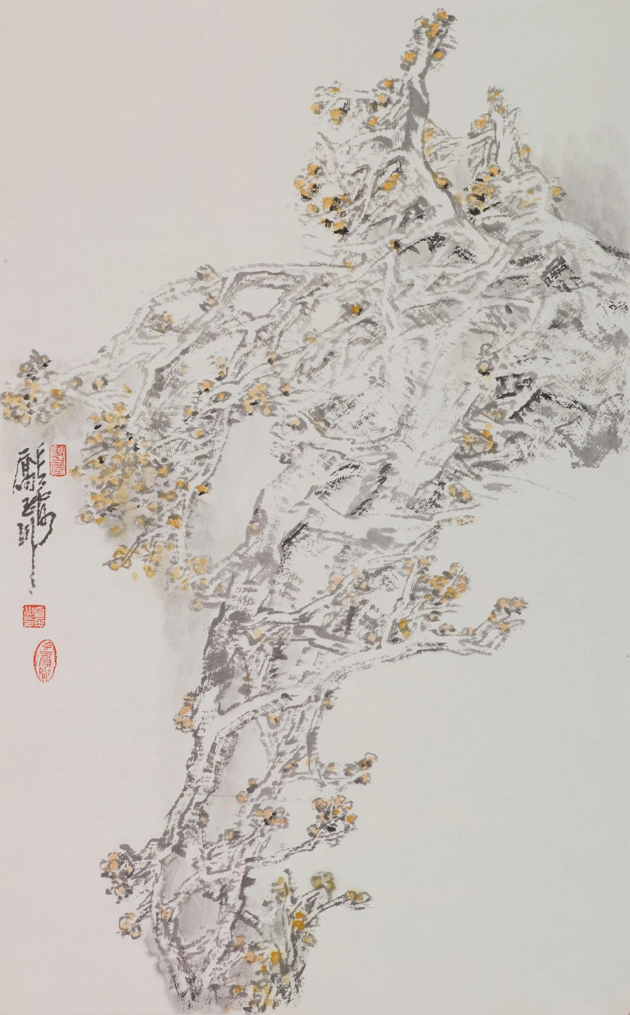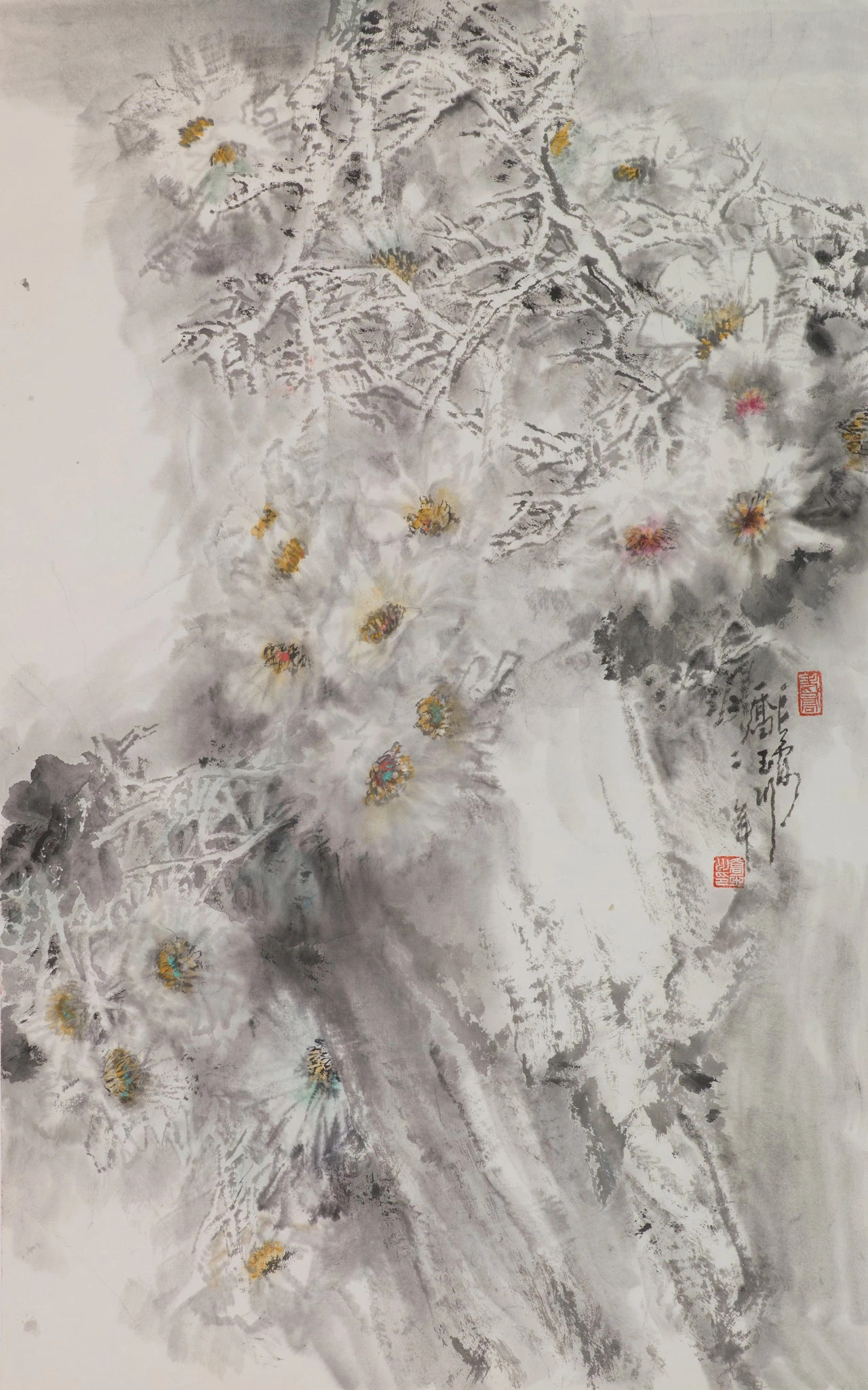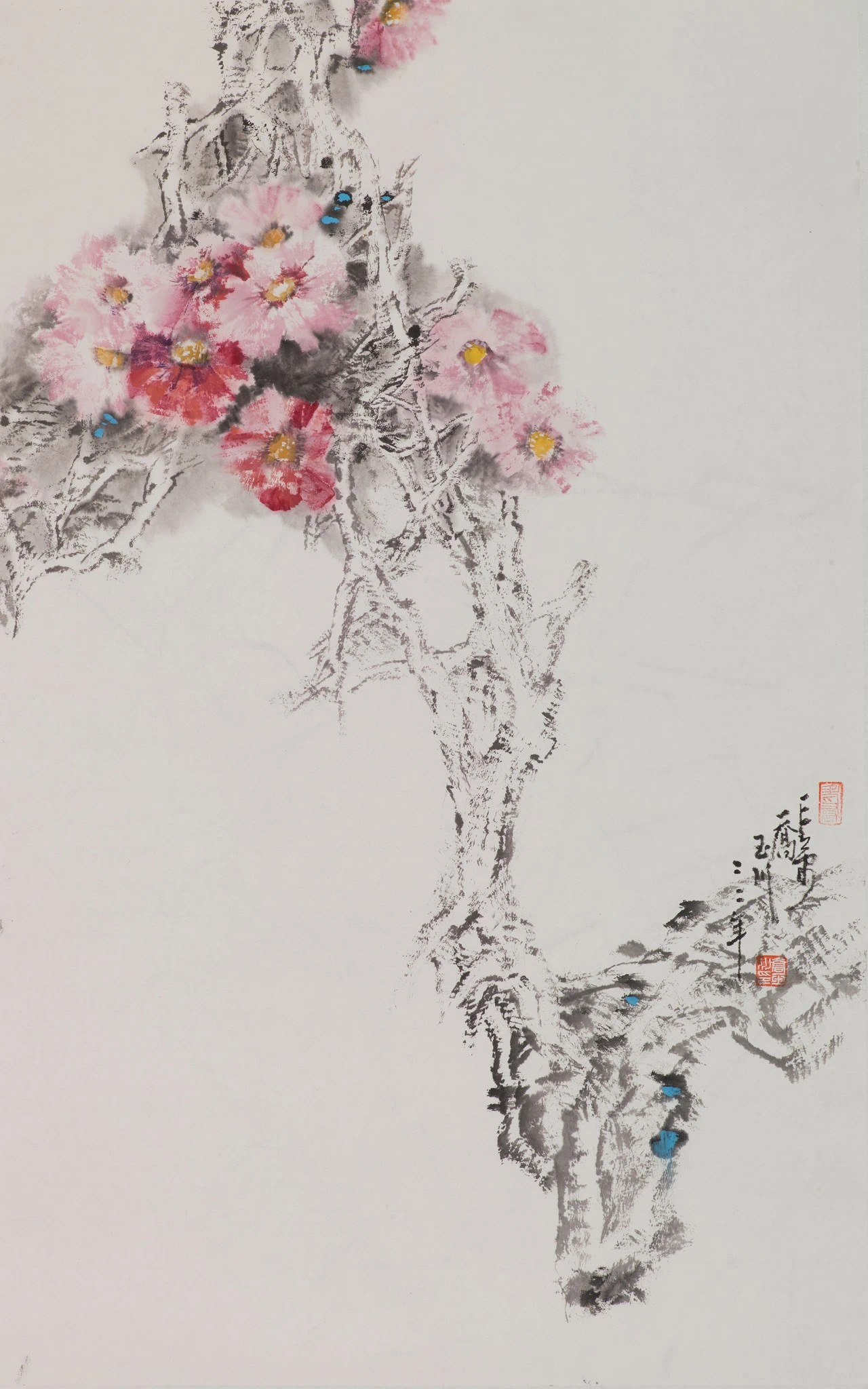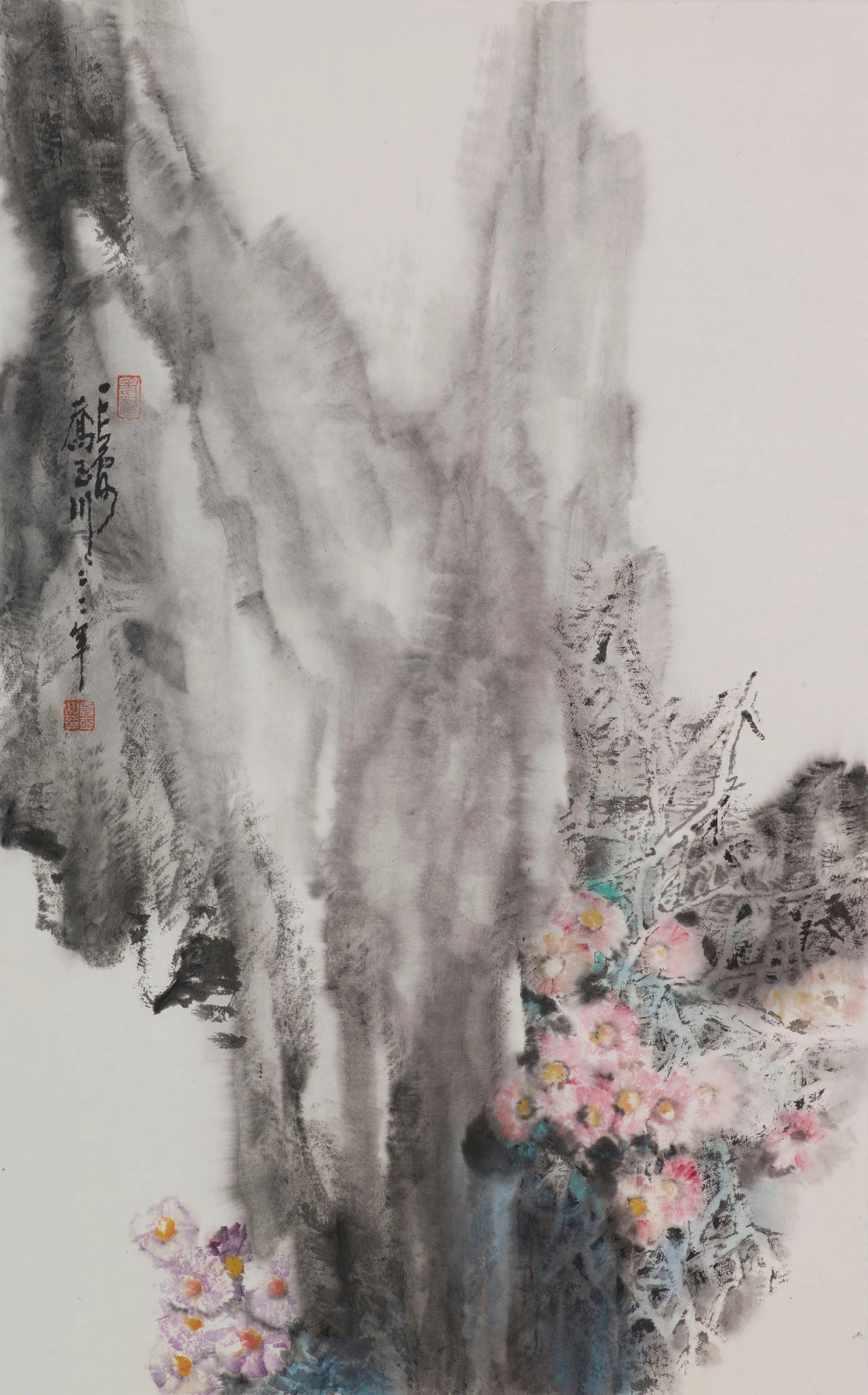 第一,人山花结合是乔玉川先生作品一个突出特点。中国画的分科很早就有了,他反其道而行之,重新把人山花结合起来,希望通过在人山花不同的领域中使他的笔墨得到相互的支撑,找到自己的笔墨语言。从这点来说,他虽然三科兼修,但其核心还是在人物上,希望通过这种结合最终解决人物画的问题。第二,在题材上,他提出了一个对偶概念,比如黑与白、粗糙与细腻、老与少、动与静、繁复与简单,通过对比的方式做哲学上的思考,体现了一种道家意识。第三,正是出于对解决人物画问题的思考,他将探索的焦点放在了笔墨上。他的笔墨体现出南方笔墨温润的特点,呈现出了北人南相的面貌。上世纪80年代,中国画的变革受西方现代艺术的影响,很多画家丢弃了写实、素描,但他反其道而行之,没有成为热潮中的一员,而是保持了写实基础上素描的因素,今天看来,他探索出了自己新的面貌。
