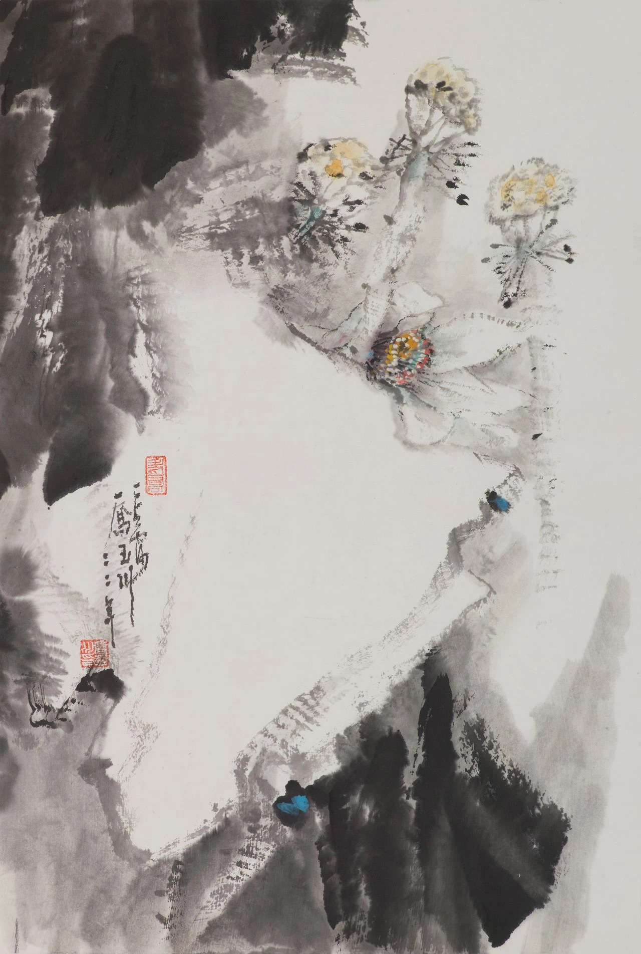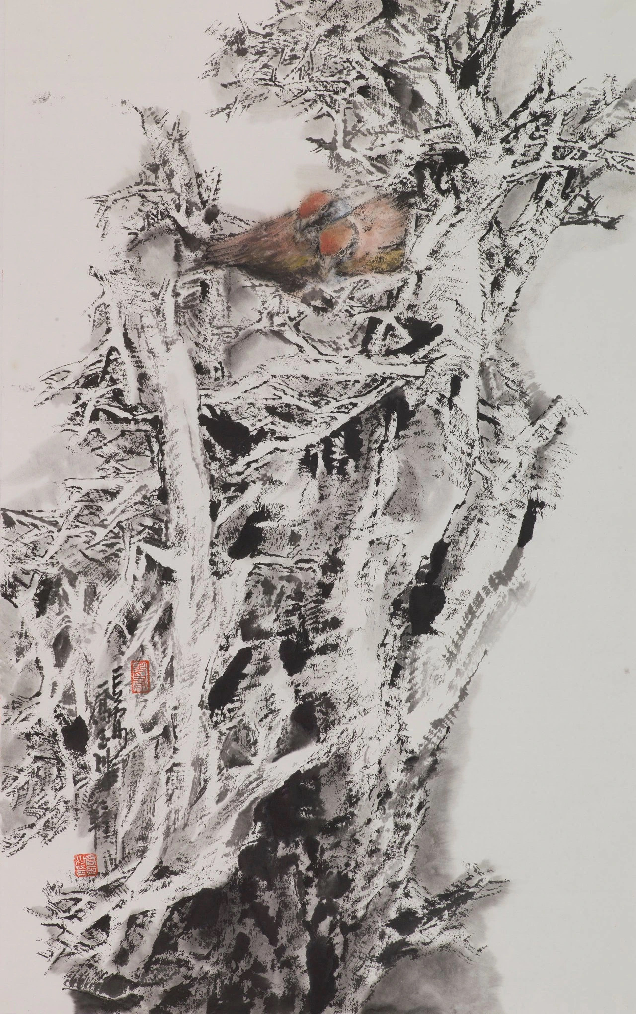 乔玉川先生的创作题材多元化,人物、山水、花鸟都有涉猎。呈现出的面貌,具有独特的个人样式和独特的审美意义。他的绘画,体现出的是一种融通之道、虚实之道、创新之道,也是一种基本之道。表现为四个方面:第一,创作观念上的融通性,乔老师是学院派出身,受过严格的素描训练,在他的画里面,水墨和素描的结合体现得很完美。第二,他的线条采取了一种抖笔的方式,形成一种空中的效果。第三,虚中见实的笔墨表达。第四,对唯美韵致的突出,他通过塑造典型,达到对灵魂深处的掘挖。