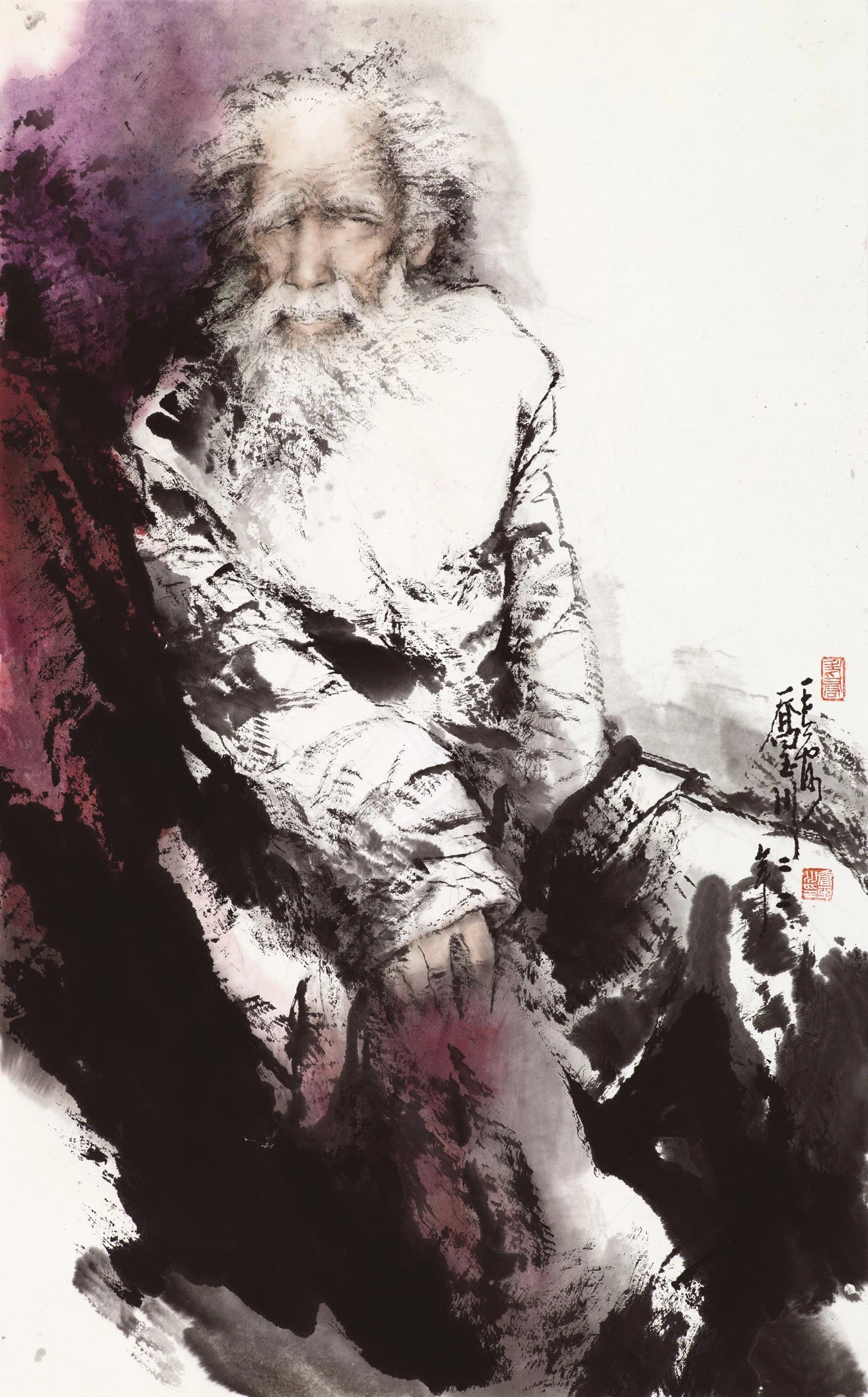 我对乔玉川先生的创作有三点认识:第一,他在山水、人物、花鸟三科都取得了很大的成就,尤其是人物画,非常精彩。其艺术精神是建立在中国传统绘画审美精神上,重视人物内心世界的表达与神态的表现。第二,他很好地处理了头部和身体服装背景之间的关系,脸部表现得比较细致,服装、身体背景则用墨色,形成了由线到面的结合,带有拓片的效果。他将具象和抽象、写实和写意相结合,将脸部写实精细的描写和服装背景抽象性的描绘相结合,形成了丰富的画面。第三,他将山水画山体结构的画法运用到人物画上,形成了山水画、人物画、花鸟画之间的互通,这是一种新的创造。