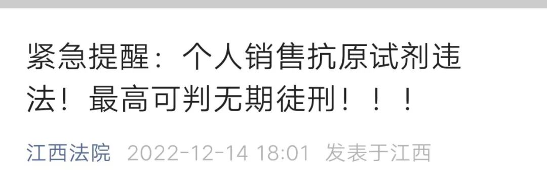 不止是江西高院,近日多地都发出警示:抗原检测试剂不同于口罩,个人私自贩卖新冠抗原试剂是违法行为!