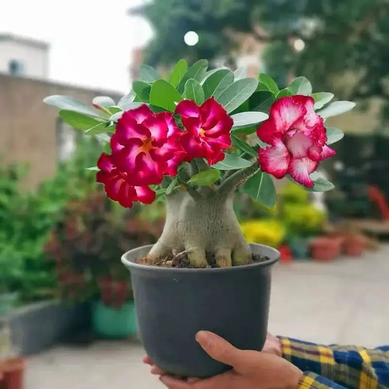 沙漠玫瑰,也又叫天宝花,是近年来在网上非常流行的盆栽花卉。别看沙漠玫瑰的主干很粗壮,像个“大肚子”,就以为它很抗冻。其实它的肚子里面全是储存的水分,很容易被冻伤。