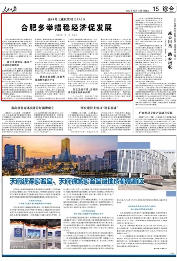 今年以来,合肥市高效统筹疫情防控和经济社会发展,成立稳经济专班助企纾困,推动经济增长稳中向好。今年1—10月,合肥市工业投资增长23.3%,增速居长三角GDP万亿城市第二位。