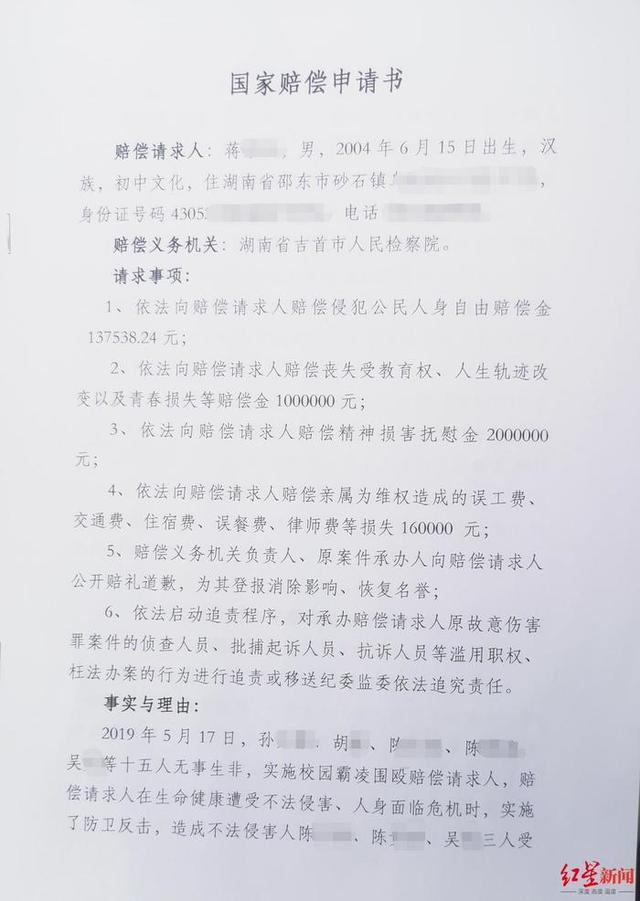蒋佑华告诉记者,小蒋本人不愿再来到吉首这个“伤心之地”,因此由祖父及代理律师代为提交国家赔偿申请书。在申请书中,小蒋向吉首市人民检察院提出了近330万元的索赔诉求,其中包括侵犯人身自由赔偿金13.7万余元、丧失受教育权及青春损失100万元、精神损害抚慰金200万元等。