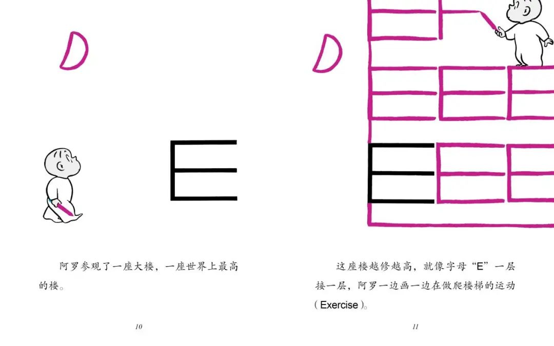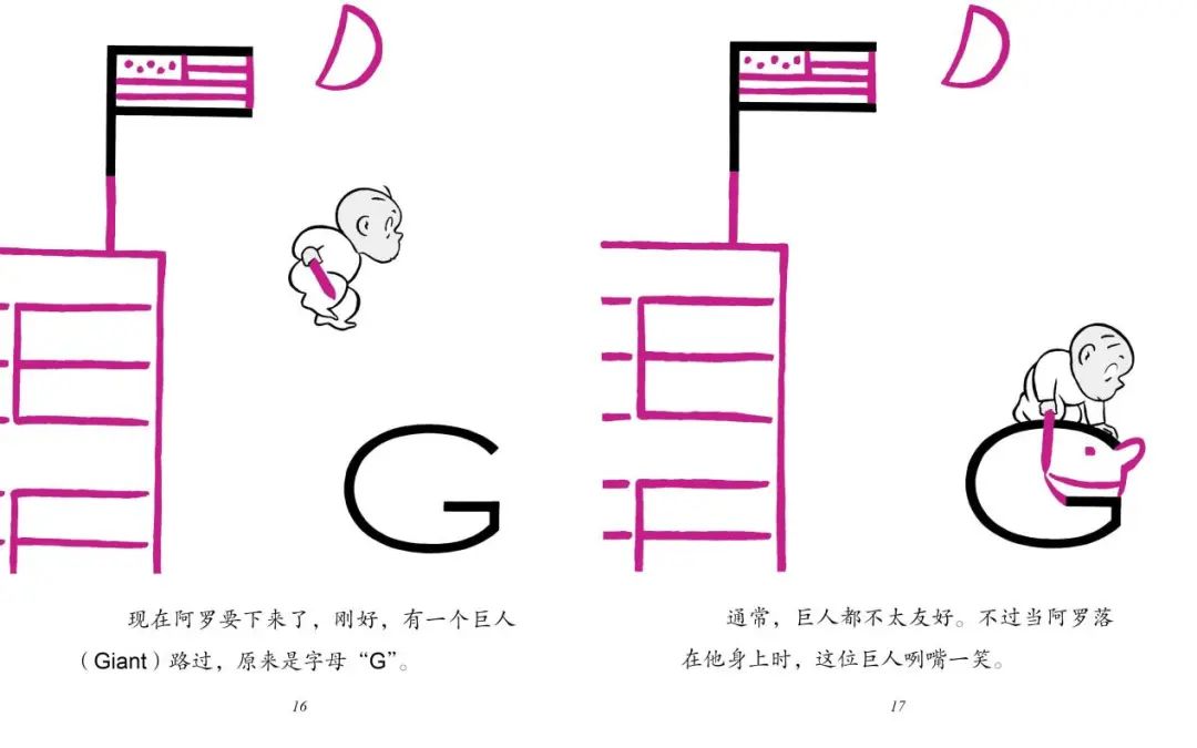 用不着字母卡片,也用不着对孩子反复强调这个是 A 这个是 B,翻开绘本看看阿罗的字母冒险,在天马行空的想象与欢笑中达成了让孩子识记字母形态的英语启蒙教育目的,就是这么简单省力。