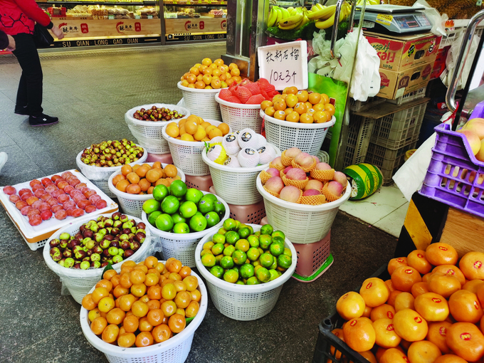 在珠泉农贸市场的一家水果摊上,品类齐全地摆满了各种水果,包括最火的黄桃。摊位老板说,黄桃夏季上市,现在已经过季了,价格偏高,卖15元一斤。与之对应的,应季水果里柑橘类、冬枣、苹果维C含量都不错,价格也比较亲民,购买量更多一些。