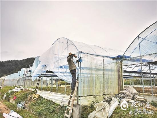 得知强冷空气即将来袭,12月14日早上,安溪大坪乡丰村蔬菜专业合作社负责人陈建华就安排工人对基地上的温室大棚棚膜进行修复,工人们或者对大棚卷膜机进行加固,或者对老化的大棚卷膜机进行更换。陈建华介绍,对于可以上市的蔬菜,这几天正在抓紧采收。
