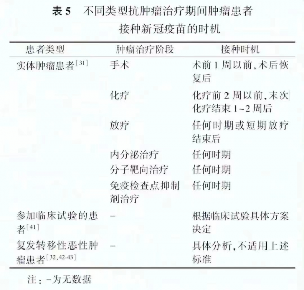 需注意的是,不同类型抗肿瘤治疗期间,实体恶性肿瘤患者新冠疫苗接种时机有所差异。