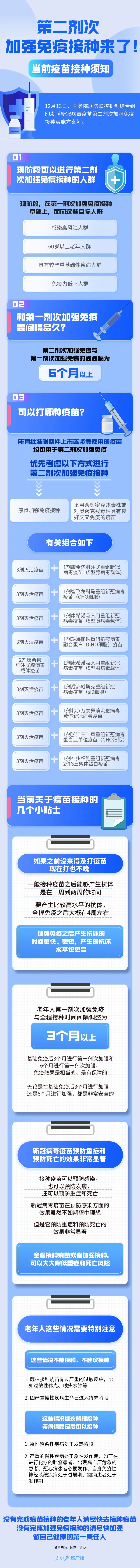 夏刚介绍,在现阶段依然严峻复杂的疫情防控形势下,老年人等高风险人群持续面临被感染的风险。因此,国务院联防联控机制近日对新冠病毒疫苗接种策略做了进一步的调整和完善,感染高风险人群、60岁以上的老年人群、具备较严重基础性疾病的人群和免疫低下的人群在完成第一剂次加强免疫接种满6个月后,可进行第二剂次加强免疫接种。