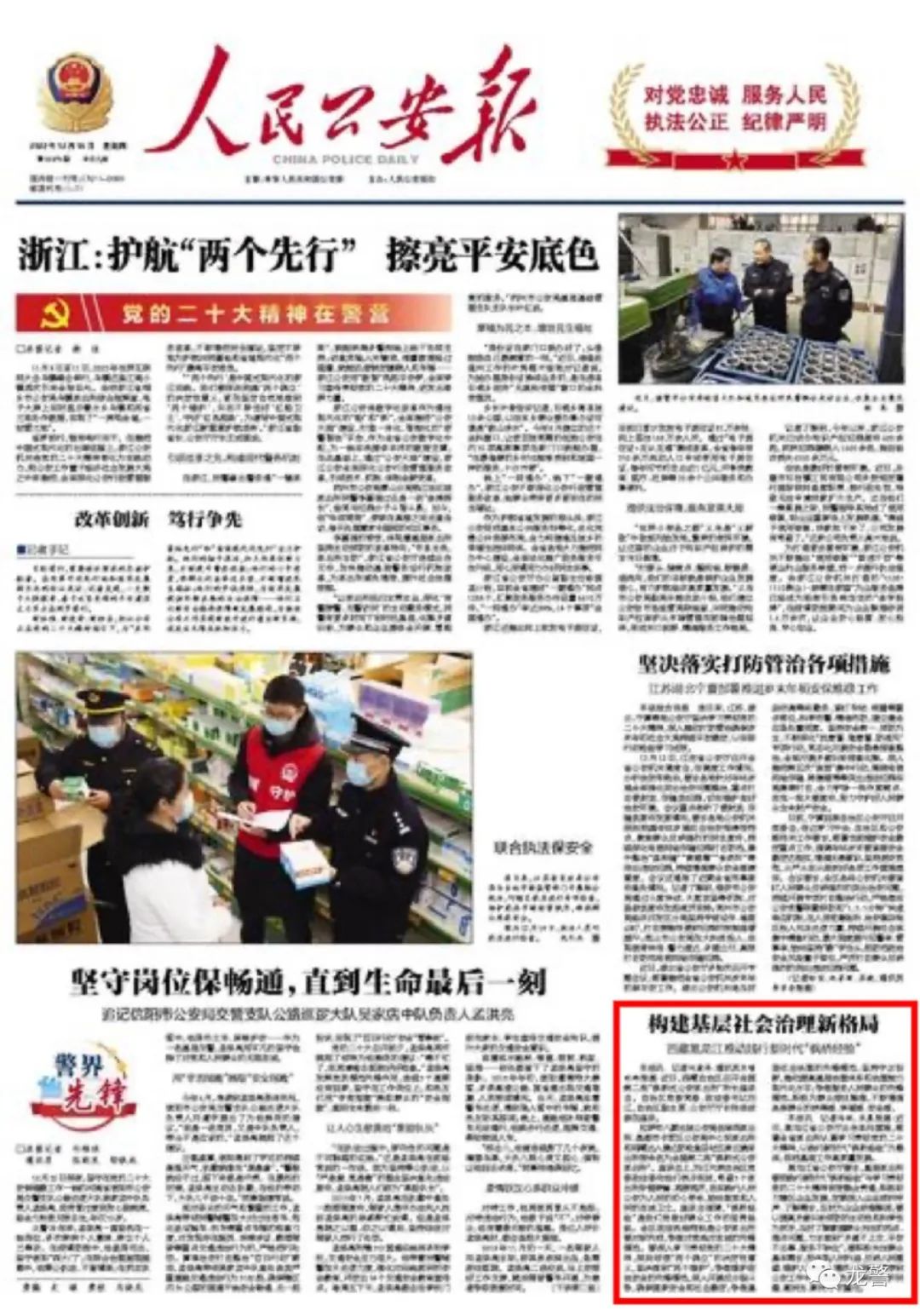 黑龙江省公安厅要求,基层派出所要把践行新时代“枫桥经验”与学习贯彻党的二十大精神有效融合贯通,积极助力辖区企业发展,定期深入企业倾听呼声、了解需求,及时为企业纾难解困;要以提高矛盾纠纷预防的主动性和科学性为抓手,及时了解掌握群众关注的热点、难点问题,力求做到“矛盾不上交、平安不出事、服务不缺位”;要积极关注群众基本需求,把体现人民利益、反映人民愿望、维护人民权益、增进人民福祉贯穿到公安工作中,切实担负起“保民安、护民康、惠民生、聚民力”的重任。
