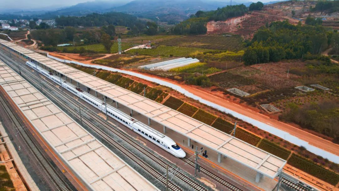 穿哀牢、跨红河……弥蒙高铁不仅凝结了众多建设者的心血与汗水,也承载着红河的发展机遇与百姓的殷切期盼。弥蒙高铁位于红河哈尼族彝族自治州境内,是全国30个少数民族自治州内的首条城际高铁,北起南(宁)昆(明)客运专线弥勒站,向南途经弥勒市、开远市,止于红河州州府蒙自市,正线长约107公里,设计开行旅客列车时速目标值为250公里。全线共设弥勒、竹园、朋普、开远南、红河5座车站。其中,弥勒站为既有车站,其他为新建车站,车站建筑风格充分融合地域文化,呈现“一站一景”鲜明特色。