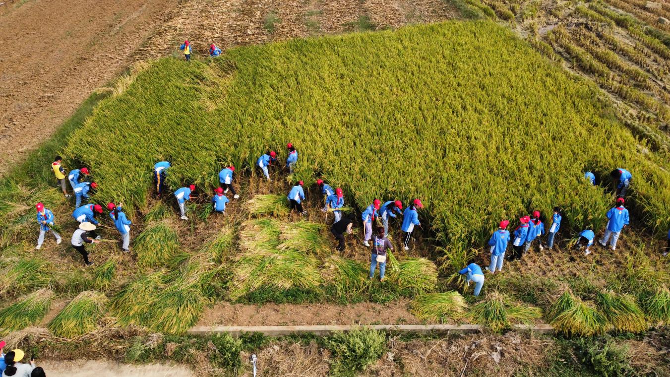 李楼小学学生走进张庄村水稻基地挥舞镰刀体验收割稻谷。通讯员供图。