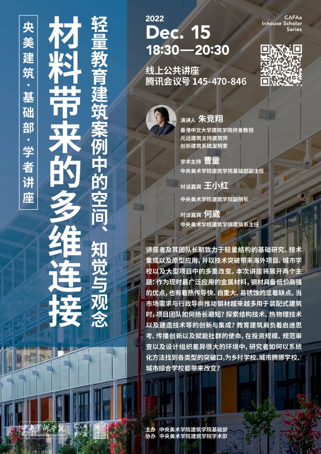 讲座者及其团队长期致力于轻量结构的基础研究、技术集成以及原型应用,并以技术突破带来海外项目、城市学校以及大型项目中的多重改变。本次讲座将展开两个主题:作为现时最广泛应用的金属材料,钢材具备低价高强的优点,也有着热传导快、自重大、易锈蚀的显着缺点。当市场需求与行政导向推动钢材越来越多用于装配式建筑时,项目团队如何扬长避短?探索结构技术、热物理技术以及建造技术等的创新与集成?教育建筑肩负着启迪思考、传播创新以及赋能社群的使命,在投资规模、规范审查以及设计组织差异很大的环境中,研究者如何以系统化方法找到各类型的突破口,为乡村学校、城市腾挪学校、城市综合学校都带来改变?