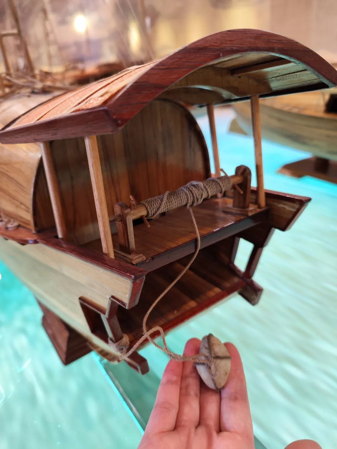 我们仔细端详这些汴河船模型,发现每艘船首都有巨大的石碇,还有存放石碇的槽口。汴河货船设有存货的圆棚,还有向左右舷打开的货舱盖。