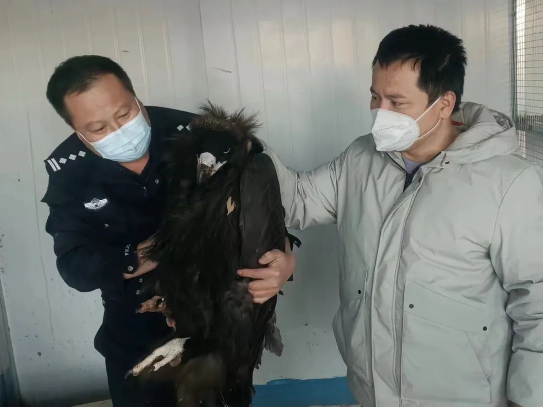 接警后,民警立即赶往报警地点,经辨认,这只“大鸟”为国家二级保护动物——秃鹫。经检查,秃鹫因翅膀受伤不能飞翔,多日没有进食导致体力不支。民警将家中的肉带来切成碎块喂食秃鹫,随后将秃鹫移交到化德县林业和草原局野生动物保护中心,待伤口恢复后放飞自然。