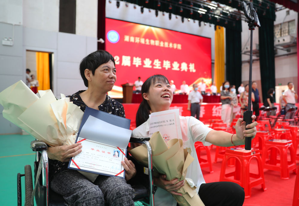 6月27日,在湖南省衡阳市湖南省环境生物职业技术学院毕业典礼会场,带着妈妈上大学的邹晴在领到毕业证和湖南省优秀毕业生证书后与妈妈自拍合影留念。新华社发(曹正平摄)
