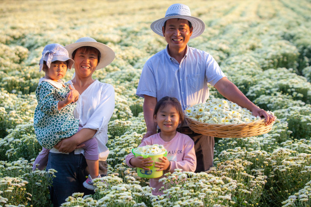 9月21日,在山东省淄博市高青县黑里寨镇黑二村,种植中药材的“70后”家庭农场主张新广(右一)和家人在菊花田间合影留念。新华社发 (张维堂 摄)