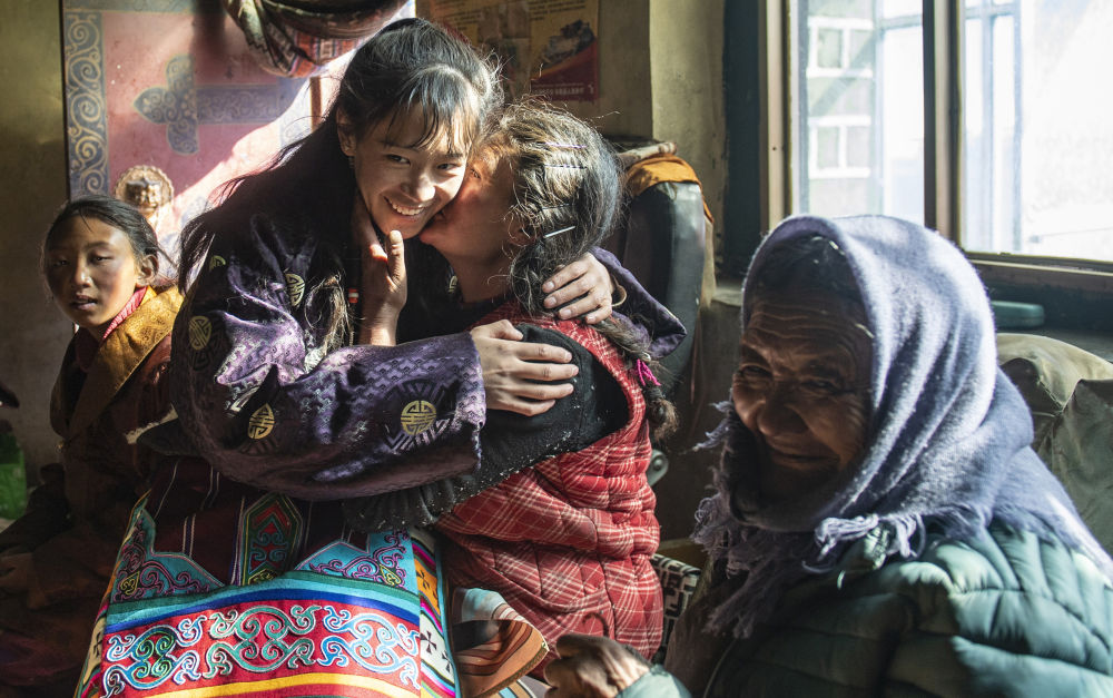 1月18日,在西藏当雄县纳措乡甲嘎村,放寒假回家的江苏食品药品职业技术学院中药学专业大学生旦增卓玛(左二)和母亲边卓说悄悄话。新华社记者 孙瑞博 摄
