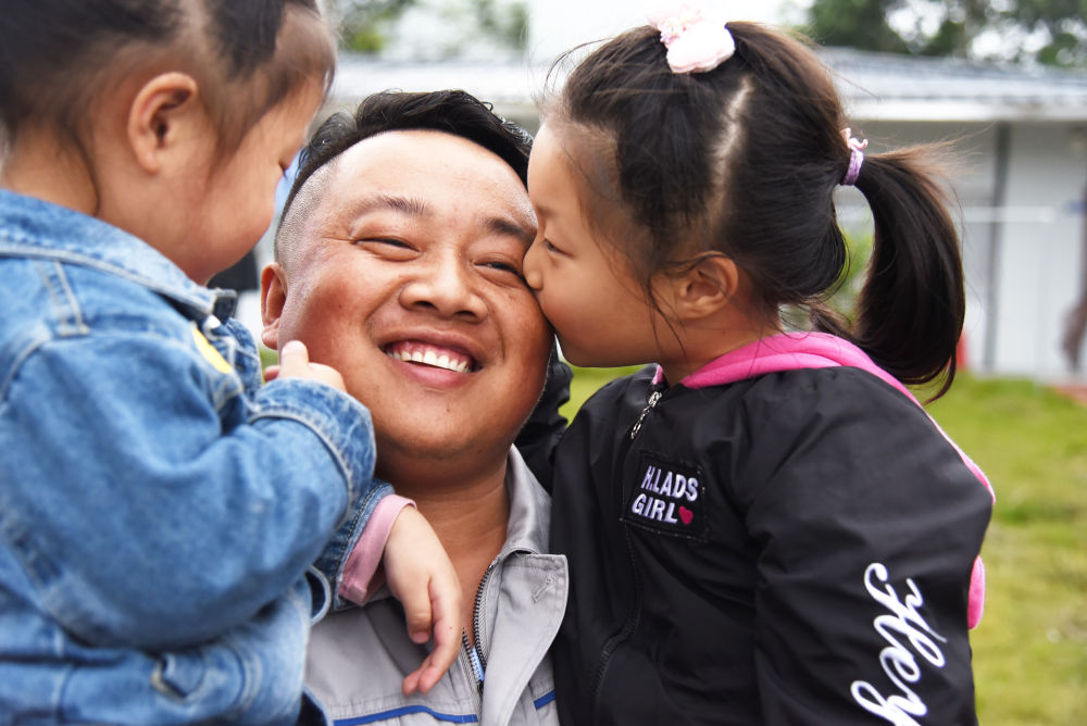 1月24日,在广东省汕尾市海丰县,沈海高速深圳到汕尾段改扩建项目工作人员杨兴义在板房宿舍前与春节前夕来团聚的孩子们拥抱亲吻。新华社记者 田建川 摄