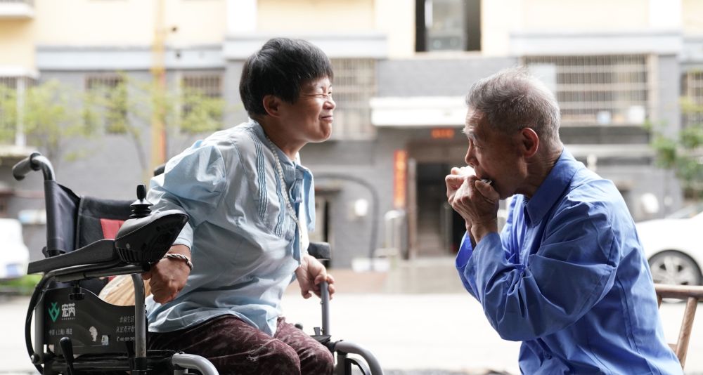 6月18日,在江西省新余市宝泰小区,72岁的廖斌晟为从小患有先天性脑瘫、智力水平只相当于7岁儿童的女儿廖永红吹奏口琴。新华社记者 胡晨欢 摄