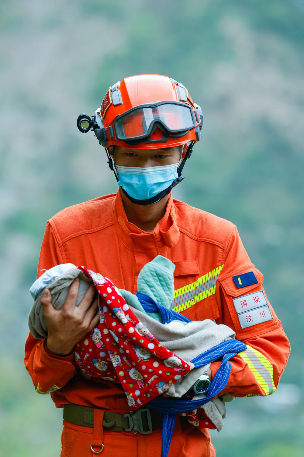 9月6日,在四川泸定地震救援中,阿坝森林消防支队汶川大队队员张自立怀抱一名从泸定县得妥镇湾东村疏散出来的2个月大的婴儿,前往安全地区。新华社记者 沈伯韩 摄
