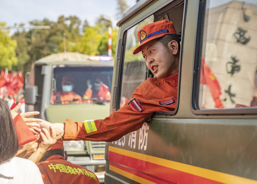8月28日,在重庆市北碚区,参与山火扑救的云南森林消防队员在完成任务撤离时与群众握手道别。新华社记者 黄伟 摄