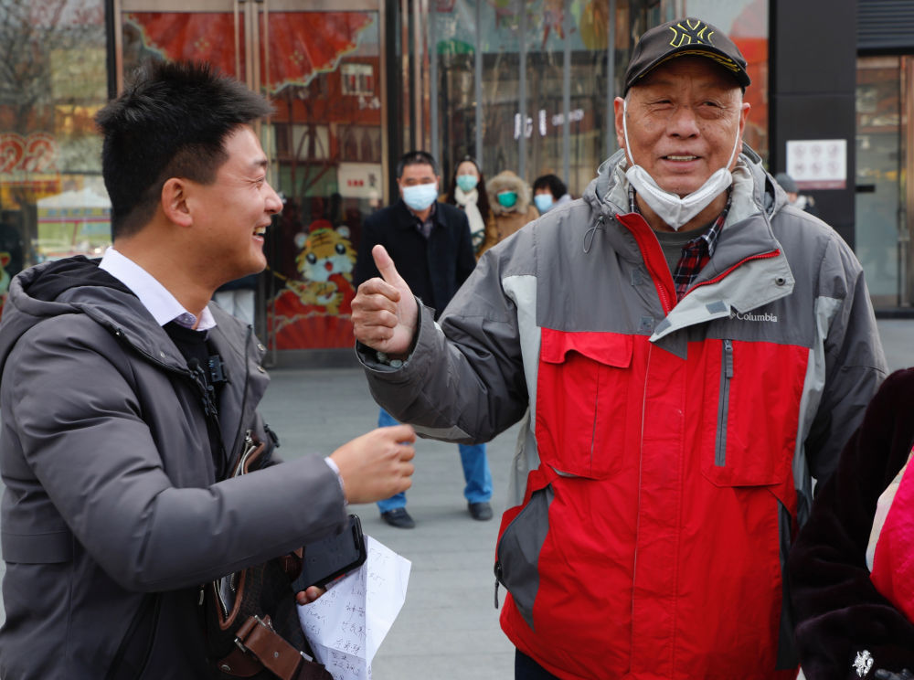 1月16日,春节前夕,33岁的陈伟(左)专程从江苏如皋老家赶到南京,把他以前经营的水果店的充值余额退还给会员,受到人们赞扬。新华社记者 季春鹏 摄