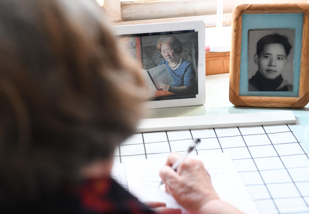 5月17日,在安徽省芜湖市,83岁的张爱兰老人在家中写作。书桌上摆放着她和去世37年的爱人徐国诚的照片。新华社记者 张端 摄