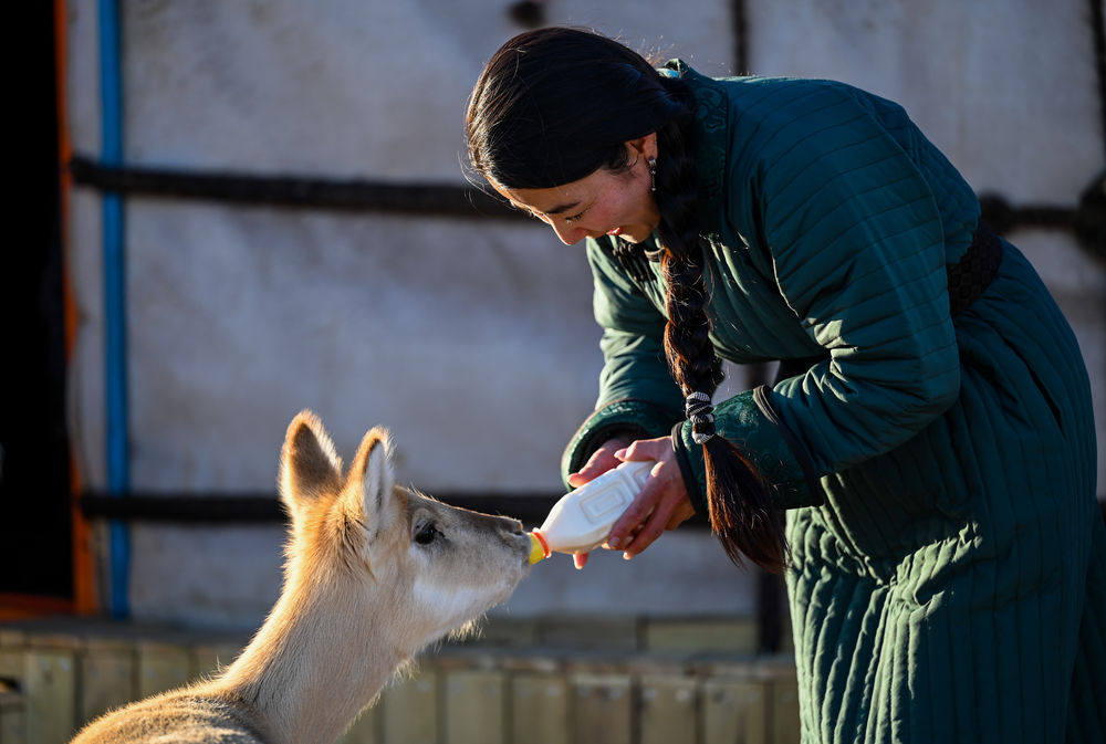 1月13日,在内蒙古锡林郭勒盟苏尼特左旗赛罕高毕苏木,“80后”蒙古族姑娘乌伊汗给被救助的小黄羊“蹦泼来”喂牛奶。新华社记者 连振 摄