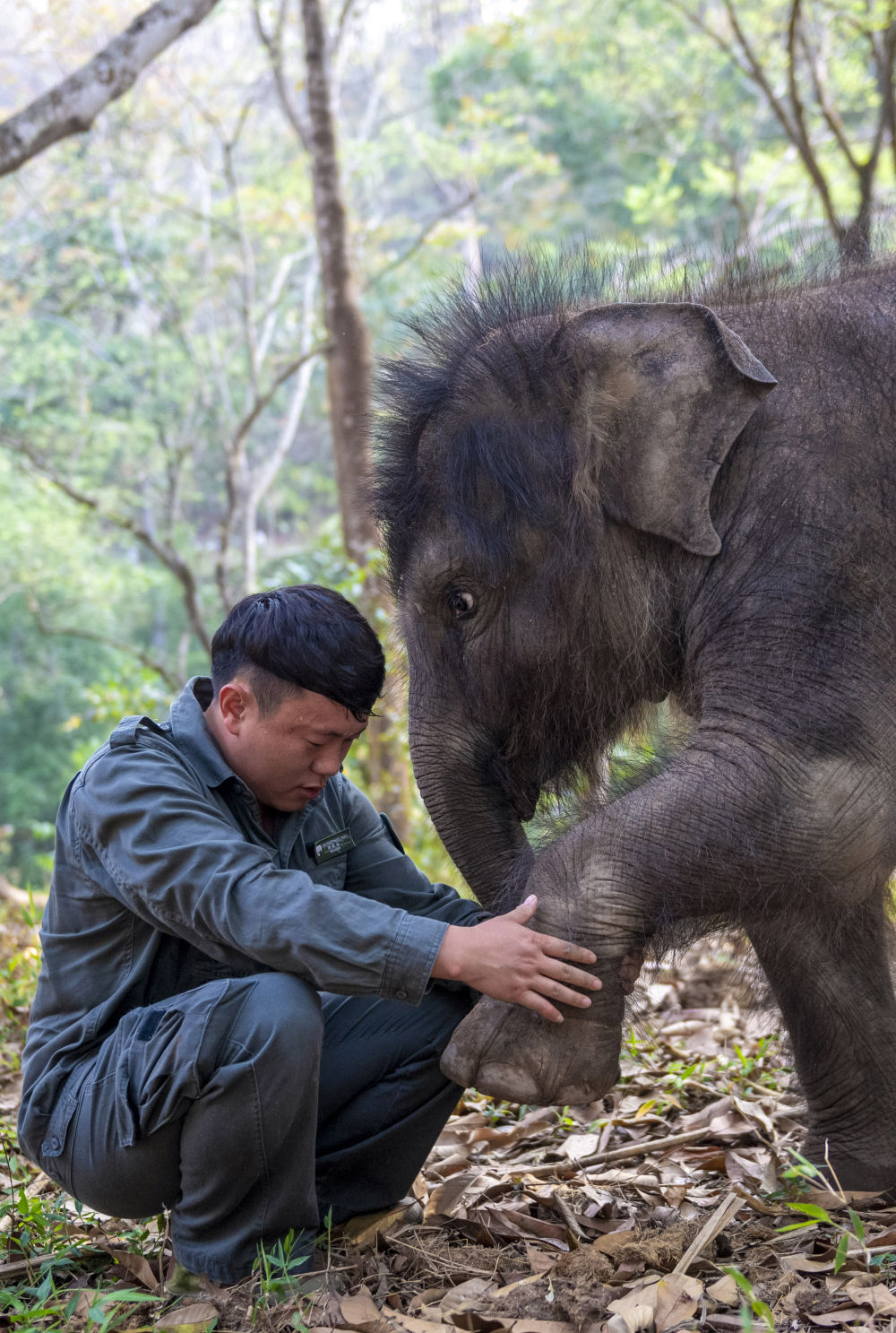 3月15日,在云南省西双版纳傣族自治州景洪市,云南亚洲象种源繁育及救助中心的“象爸爸”许云峰查看被救助幼象“龙龙”左前腿的恢复情况。新华社记者 陈欣波 摄
