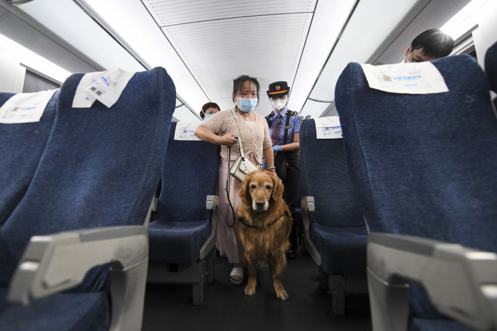 8月19日,在河源东到深圳北的G2267次车上,视障人士张莉和导盲犬满悦在列车长李双(左三)帮助下准备下车。新华社记者 毛思倩 摄