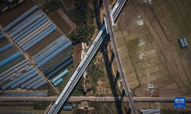12月16日,列车行驶在与昆玉河铁路(上)、滇越铁路(底层)相互交叉的弥蒙高铁线(中)(无人机照片)。