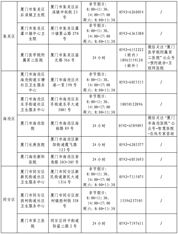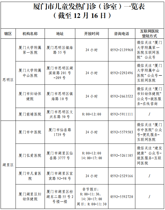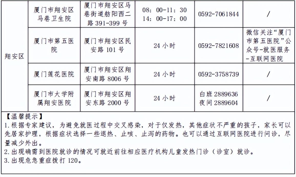 儿童需要就医及咨询怎么办?收好下方这份厦门市儿童发热门诊(诊室)一览表。