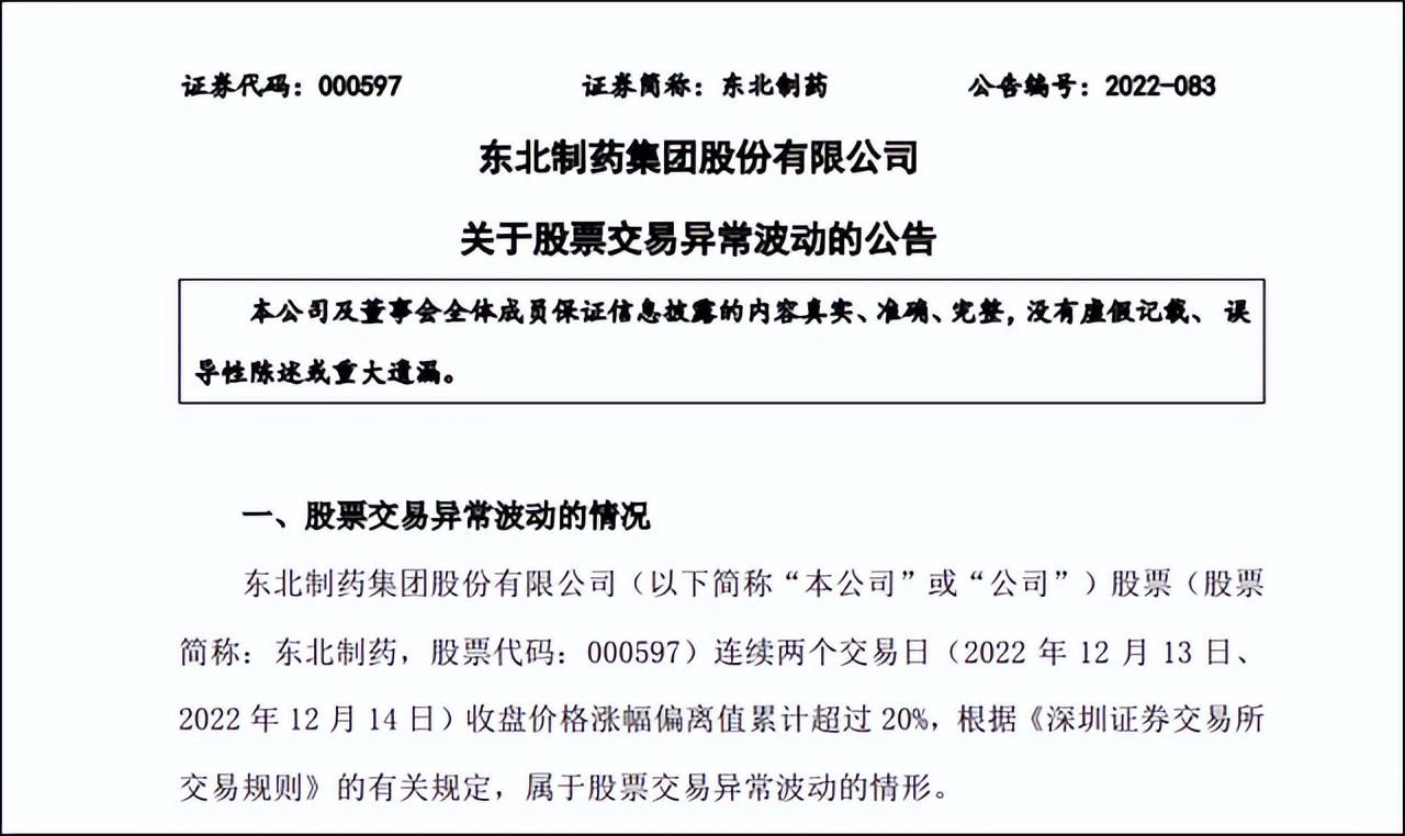 12月14日,东北制药(000597 股价7.05元,市值101.1亿元)发布异动公告,东北制药连续两个交易日 (12月13日、12月14日) 收盘价格涨幅偏离值累计超过20%,根据《深圳证券交易所交易规则》的有关规定,属于股票交易异常波动的情形。