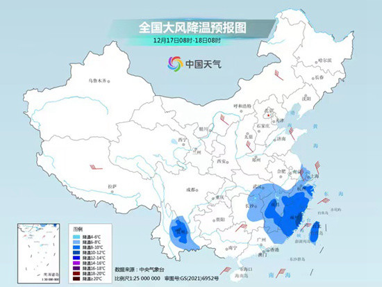 从昨天开始,这股寒潮已经正式进入最强影响阶段,今天威力仍然不减。预计今明两天,受强冷空气影响,我国南方部分地区将出现6~8℃降温,其中云南北部、福建东部等地的部分地区降温超过10℃;华北、黄淮及其以南大部地区有4~6级偏北风,阵风可达7~9级。