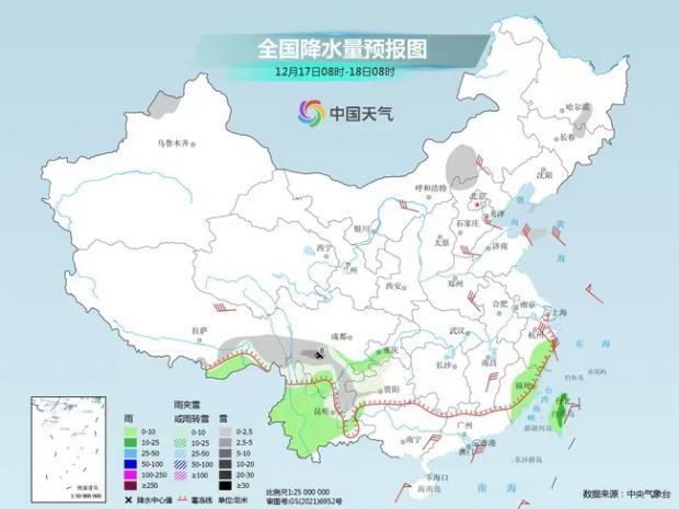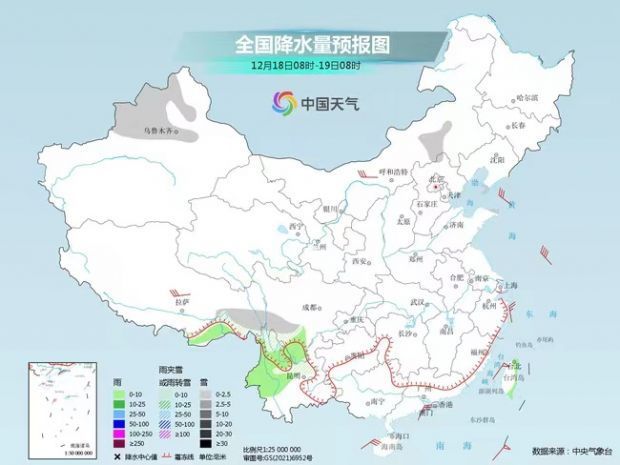 今天南方降水范围也将缩减,预计,内蒙古中东部、山东半岛、西藏东南部,川西高原南部、云南北部、贵州西部等地的部分地区有小到中雪或雨夹雪,其中,川西高原南部局地有大雪到暴雪。云南中南部、四川盆地东南部、福建中东部、浙江东部、台湾岛等地的部分地区有小到中雨。
