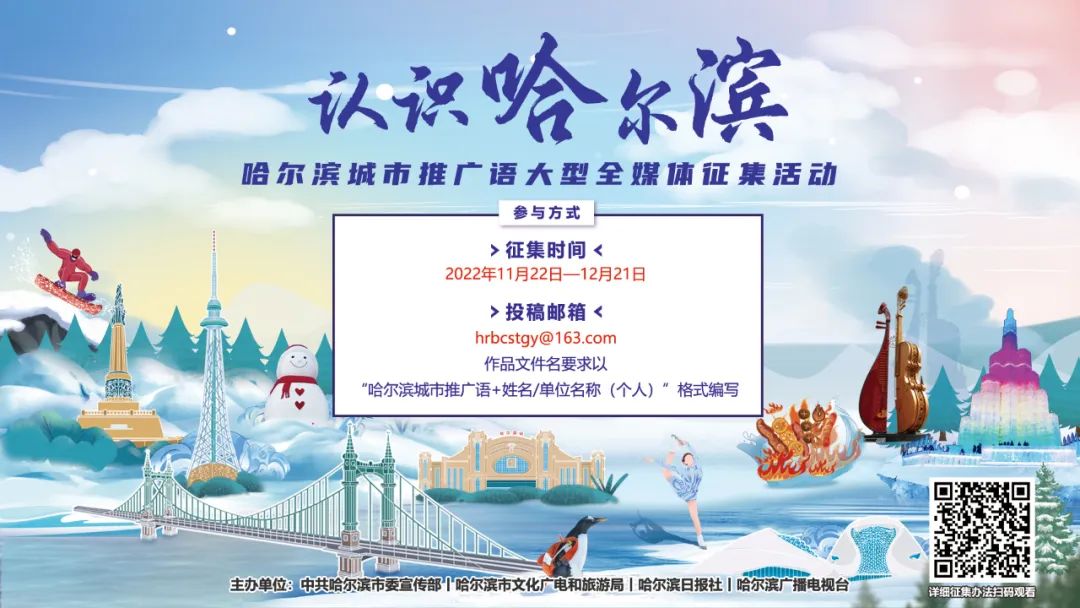 即日起《我,认识哈尔滨》人物专访栏目作为“认识哈尔滨”城市推广语征集活动系列推广短视频已经陆续推出,邀请各界名人及全网知名作家学者、网络代表等讲述他们眼中的哈尔滨。“认识哈尔滨”城市推广语征集活动由中共哈尔滨市委宣传部、哈尔滨市文化广电和旅游局、哈尔滨日报社、哈尔滨广播电视台联合举办。从2022年11月22日始至12月21日(共30天),哈尔滨向全球发出邀请,征集“认识哈尔滨”的城市推广语。