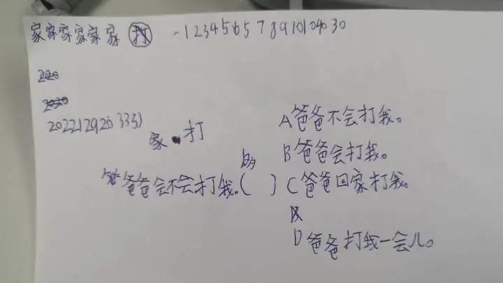 男孩在派出所等待父亲到来期间,跟值班民警要了纸和笔,写了一个“爸爸会不会打我”的猜想,自己给出了四个选项。