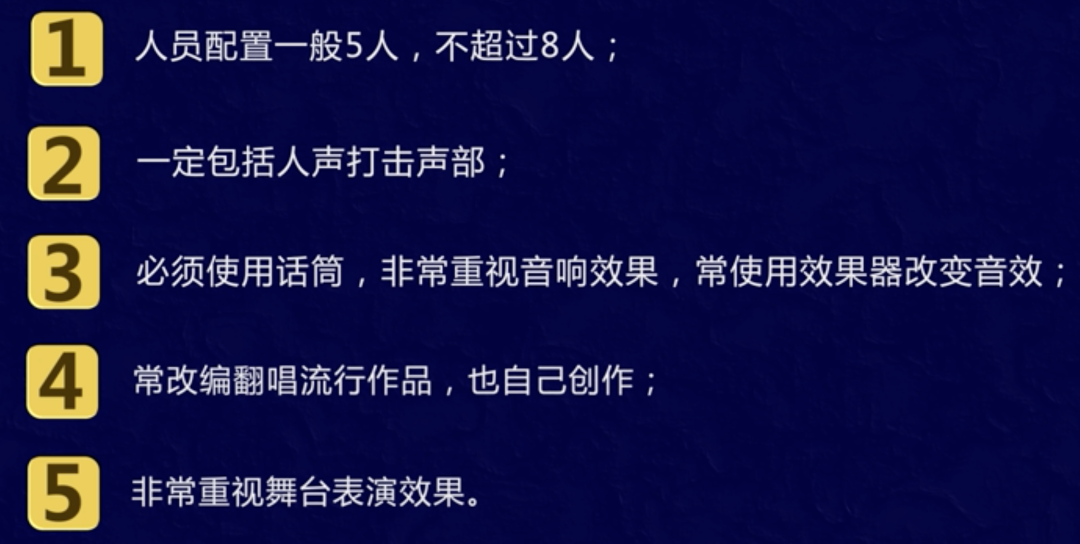 第二阶段课程主要介绍了阿卡贝拉在世界的主流分类,通过各个乐派来区别他们的特点。从而为儿童组建阿卡贝拉乐队提供有效的方法。