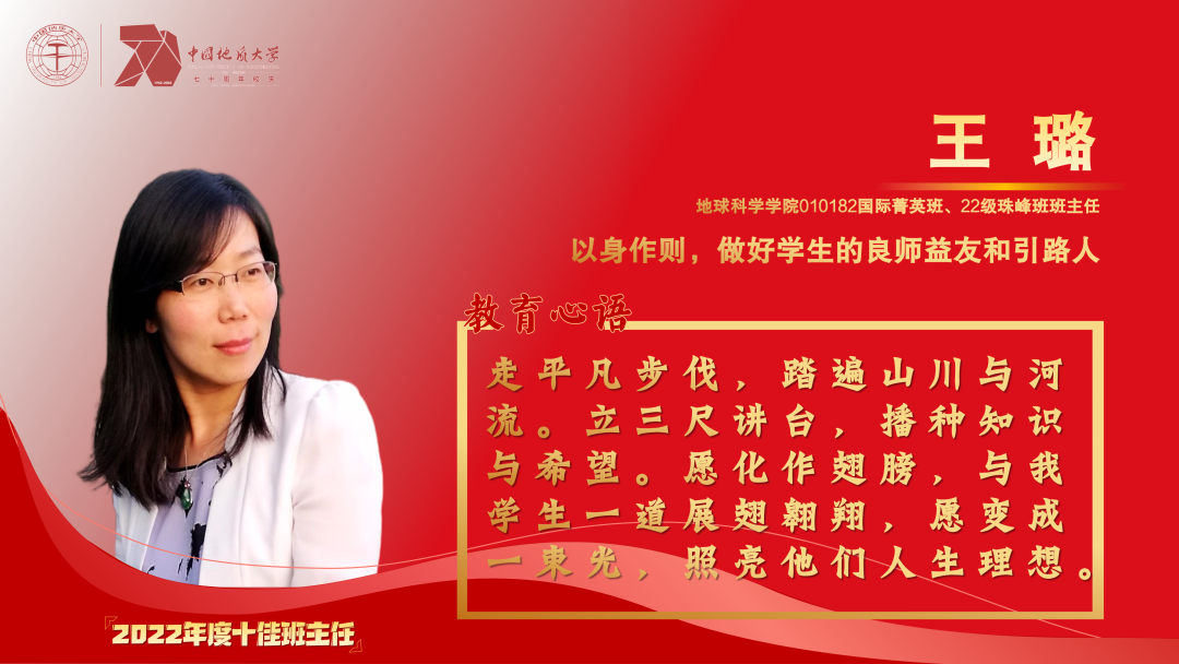 王璐,女,中共党员,研究员/博导,高研院地质过程与矿产资源国家重点实验室党支部书记,地学院010182国际菁英班、2022级珠峰班班主任。