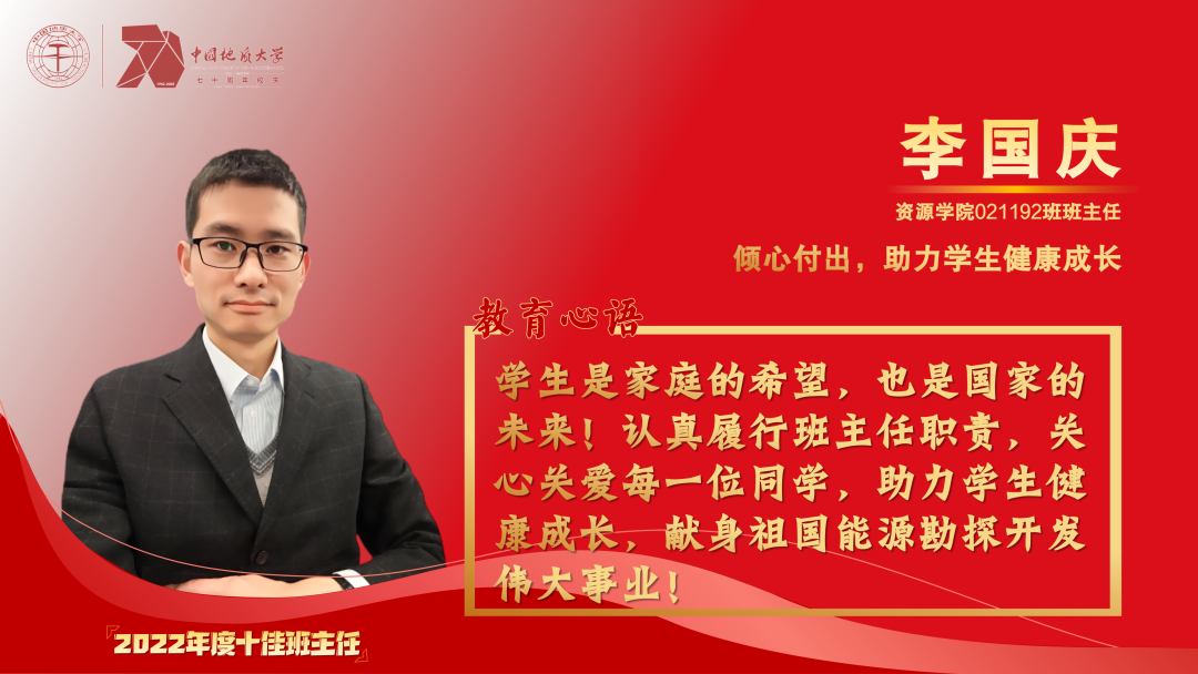 李国庆老师认为班主任是基层班级建设的组织者、指导者和实施者,他忠实践行为党育人、为国育才的初心使命,引领和陪伴同学们走好成长成才之路。他关心关爱班级每一位同学,耐心倾听青年人心声;他结合自身经历和专业经验,帮助同学们构建正确的专业思想;他主动请缨到北京周口店指导班级同学野外地质实习,循循善诱,培养同学们的科研兴趣;他鼓励同学志存高远,为祖国能源勘探开发伟大事业贡献应有的力量。所带班级获评校先进班集体、五四红旗团支部,班级党员比例40%,平均学分绩点3.47、保研率46.7%,科技活动参与率73.3%,多名学生获国家奖学金、学校百名好班长、好支书、优秀团干等奖励/荣誉。