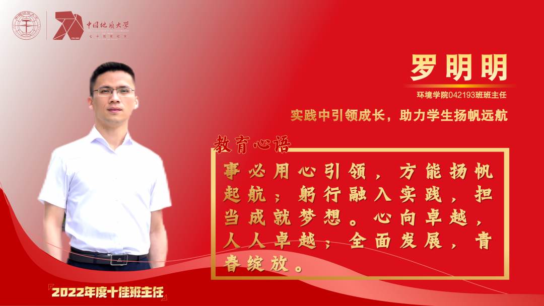 作为卓越工程师班的班主任,罗老师以身作则,积极指导班级建设,潜心传道授业解惑,成为学生的良师益友。他主动承担班级的多门专业核心课程,鼓励并指导学生参与科研实践活动,从室内授课到野外实习,在潜移默化中激化学生对水文地质环境地质专业的兴趣。他鼓励每位同学在大学期间发展一项爱好,班级同学在德、智、体、美、劳等方面综合发展,实现五育并举。他以自己曾担任院团学联主席和院研究生会主席的经历,鼓励同学们勇于担当、敢于奉献,引导学生树立起正确的世界观、人生观、价值观,班级同学在学生干部、义务参军、山区支教等方面涌现出一批先进案例,在全面建设社会主义现代化国家的火热实践中,将青春绽放出绚丽之花。