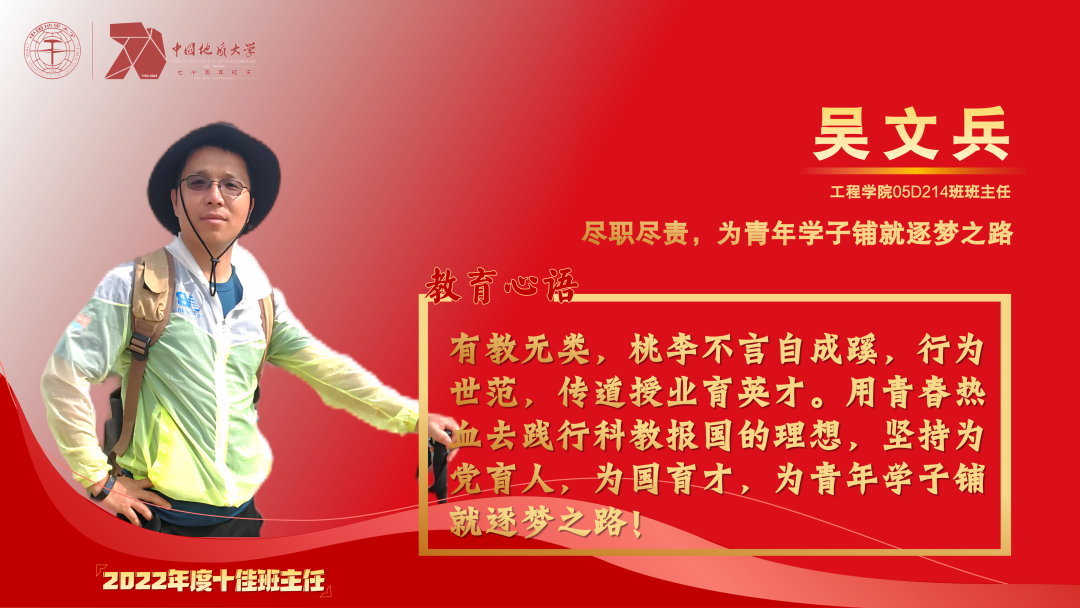 吴文兵老师深感班主任工作之重要、责任之重大,坚持“爱心+耐心+细心+责任心”的“四心”、“用心+用情+用力”的“三用”、“思想引领+班风建设”的“二加强”及“生涯规划指导+困难学生帮扶”的“二重视”的育人理念,力图为学生提供一个良好的学习与成长环境。他高度关注同学思想动态,通过党建带团建带领同学开展政治理论学习。定期与班长、团支书交流,强化班委职能;通过班团会、走访宿舍、结伴跑步、同读一本书、陪同自习、开展生涯规划、定期制定学习计划等营造良好班风学风,学生平均成绩列专业第一;通过带班级地质认识实习了解每一个同学的性格特征和学习状态;通过一对一的交流,打开学生的心扉,对症下药,给予学生最需要的帮助和关怀。所带班级先后获得学校五四红旗团支部、先进班集体标兵等荣誉。