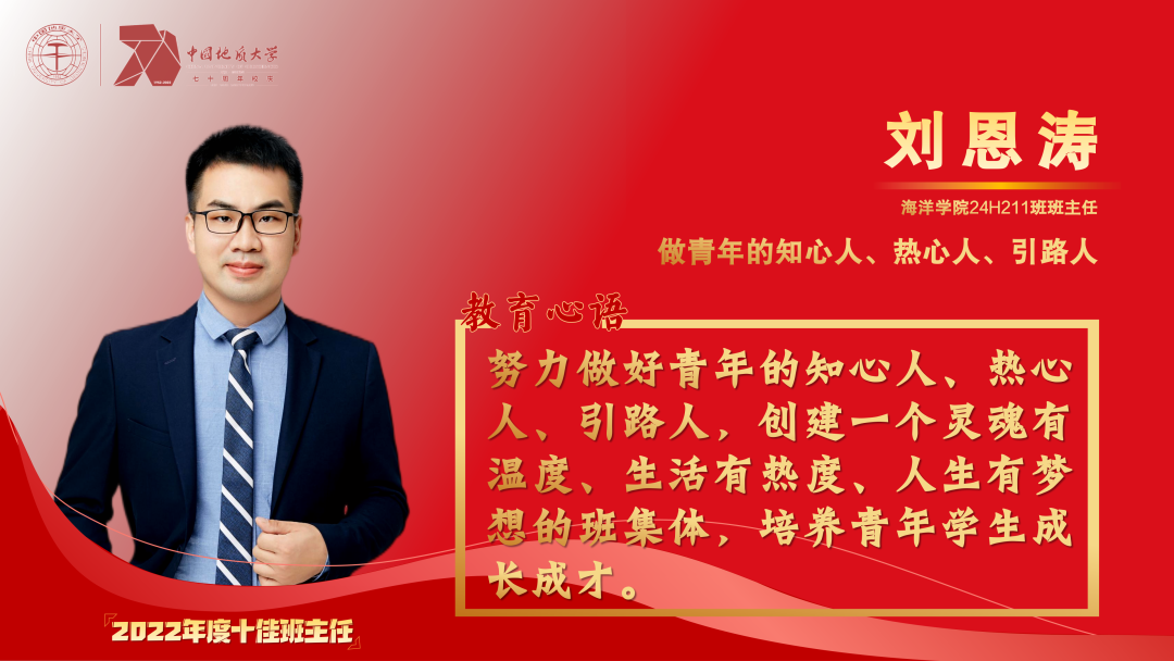 刘恩涛老师认真履行班主任工作职责,坚持“学高为师、德高为范”,在班级管理、教学和德育工作方面表现优秀,成效显著,他热爱教育事业与学生工作,已连续6年担任班主任,所负责的班集体先后被评为“校五四红旗团支部标兵”、“校先进班集体标兵”和“校级活力团支部”。他狠抓学风、班风、舍风建设,坚持每学期召开一次学风建设会、每月走访一次学生宿舍,所负责班级平均学分绩点3.4,课程平均分达85;他注重思想引领、落实立德树人,在每月的班团会上与班级学生面对面交流,倾听学生的心声,做好青年的知心人、热心人、引路人和良师益友,努力创建一个灵魂有温度、生活有热度、人生有梦想的班集体,助力学生成长成才。