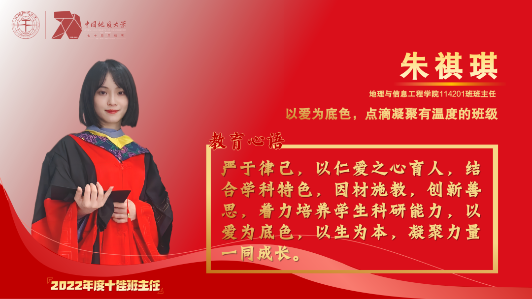 朱祺琪,女,中共党员,副教授/硕导,发表一作论文30余篇,其中ESI全球1%高被引论文3篇,获校青年教师教学竞赛特等奖,校科技论文报告会优秀指导老师、优秀班主任、优秀学务指导等荣誉称号,现担任地理与信息工程学院114201班班主任。