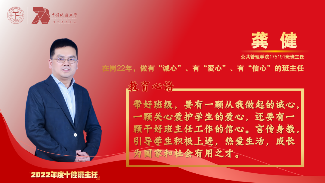 龚健老师认为要带好班级,除了要有一颗从我做起的诚心和关心爱护学生的爱心以外,还要有一颗干好班主任工作的信心。龚健老师已在班主任岗位上兢兢业业奉献了22个春秋,把满腔的热情全部倾注到了学生身上。他坚持带领学生参加一线专业实习,把论文写在中国大地上,培育学生家国情怀,培养积极上进的精神。他着力拓展学生视野,创新教学科研模式,培养学生创新能力。他经常资助经济困难学生,关注学生成长,是学生成长路上的引路人、贴心人。指导的班级有多人次获得国家奖学金、中国国际“互联网+”大学生创新创业大赛省级铜奖、全国大学生不动产估价技能大赛一等奖等奖项。所带班级班风正、学风浓,获校级“五四红旗团支部”标兵2次、校级“先进班集体标兵”2次、校级“活力团支部”一等奖1次等荣誉。班级学生成绩优异,近1/3学生保送研究生,占同专业保研总数的60%。