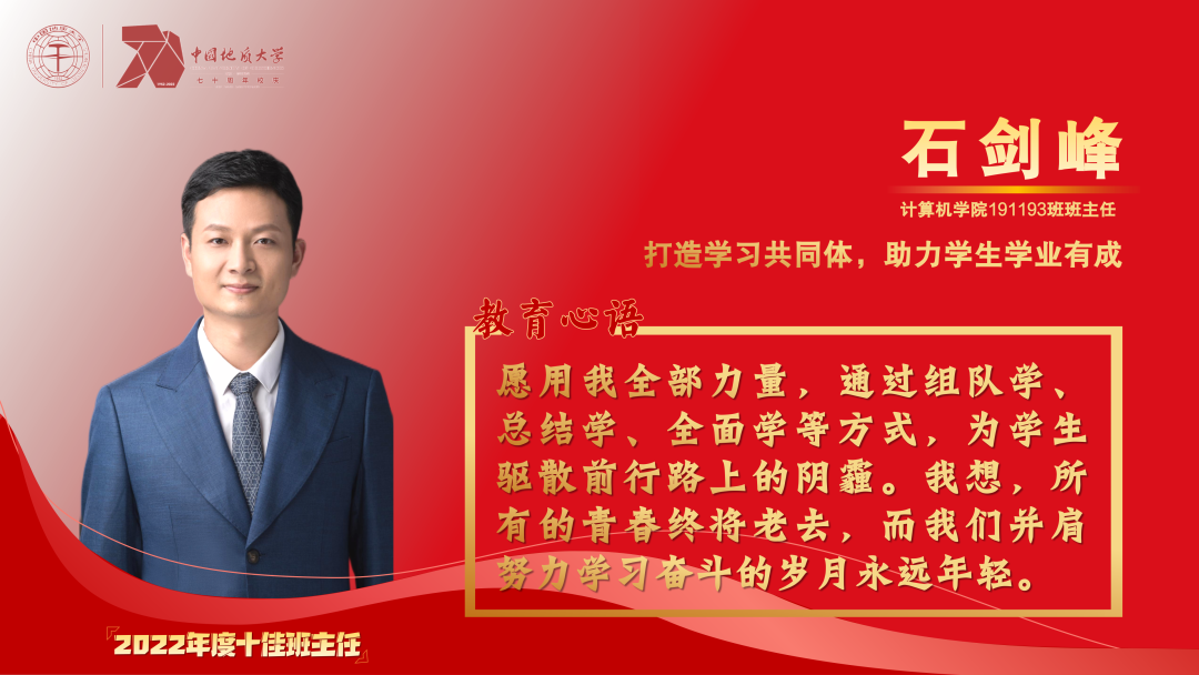 石剑峰,男,中共党员,计算机学院办公室主任,曾多次获得学校学院表彰,包括2次校优秀共产党员,2次校优秀党务工作者等。担任党支部书记期间所在支部3次获得先进基层党组织。现担任计算机学院191193班班主任。