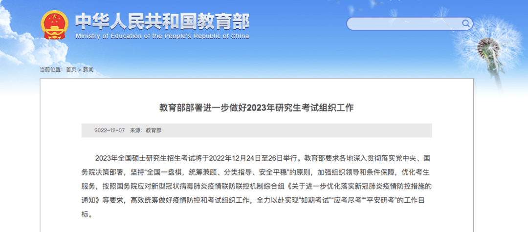 教育部表示,要坚持“全国一盘棋,统筹兼顾、分类指导、安全平稳”的原则,加强组织领导和条件保障,优化考生服务,高效统筹做好疫情防控和考试组织工作,全力以赴实现“如期考试”“应考尽考”“平安研考”的工作目标。
