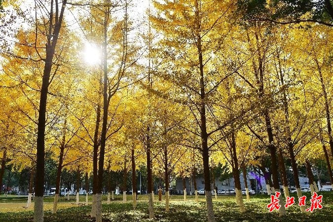 12月17日,武汉市西北湖绿化广场,银杏、垂柳、樱花树仍旧叶色斑斓。 记者李永刚 摄