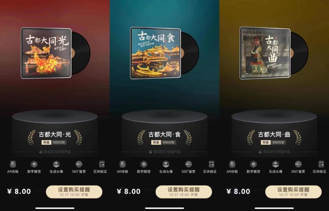 今日上线发售的大同声音,分为《食》《光》《曲》三个篇章,每款限量10000份。音频数字藏品以大同特色食物、生旺火习俗、山西梆子晋剧等为主要声音取材,那些法华寺风铃声、刀削面烹饪声、灯会数来宝表演声、二人台演奏声……相互交错展现从古都到新城中大同民众的热气腾腾生活景象。